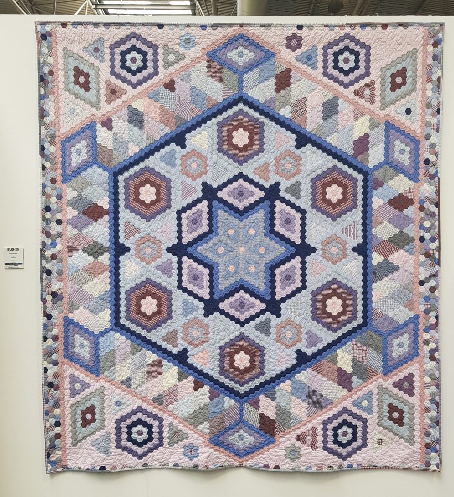 I entered a very special quilt in the Joy of Sharing category. My very good friend Marta had started hand sewing together clam shells in the 1980s. I saw her progress 10 years ago and was awestruck! Sadly Marta was diagnosed with bone cancer in the summer 2024 and died at the beginning of 2025. She had asked me to finish it. So to display this wonderful work of art, I squared it up, added a frame, used her excess material for a backing, then hand quilted/knotted the two together.