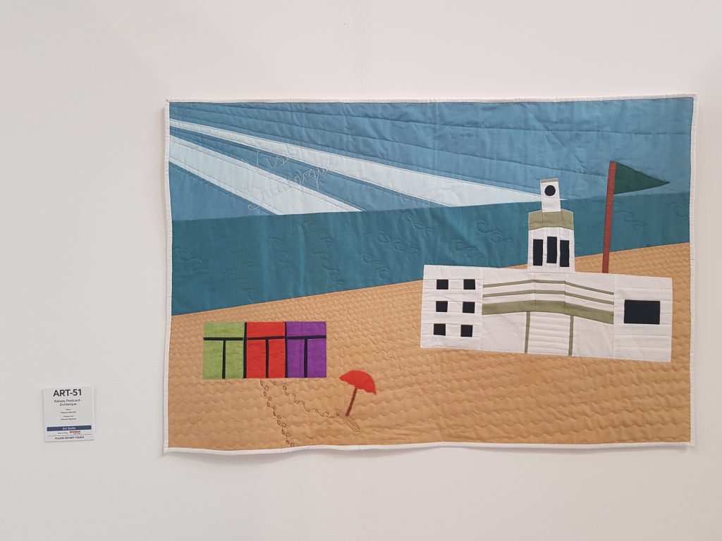 Donna Hanmer was inspired by the works Mike Fitchett showed in his talk “Travels with my sketch book” A trip to Dunkerque and a walk on the seafront gave her the ideas to create her own railway postcard quilt! The scene depicts the 1940’s life guard building and a row of lifeguard huts.